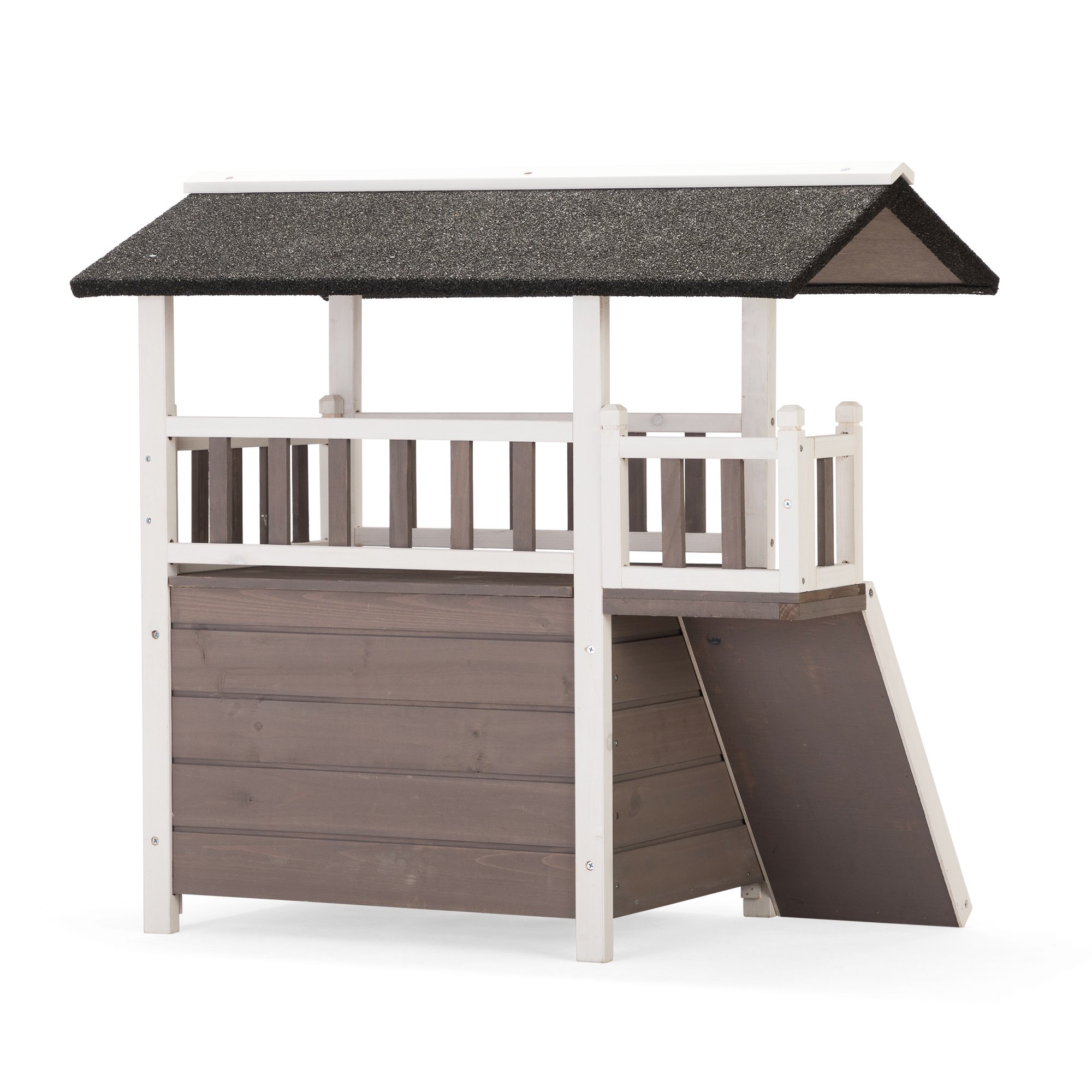 Home > 2-Tier Outdoor Wooden Dog House, Weatherproof Dog Hutch with A Large Balcony, Sisal Scratching Pad Ladder, Gift for Pets, Gray and White