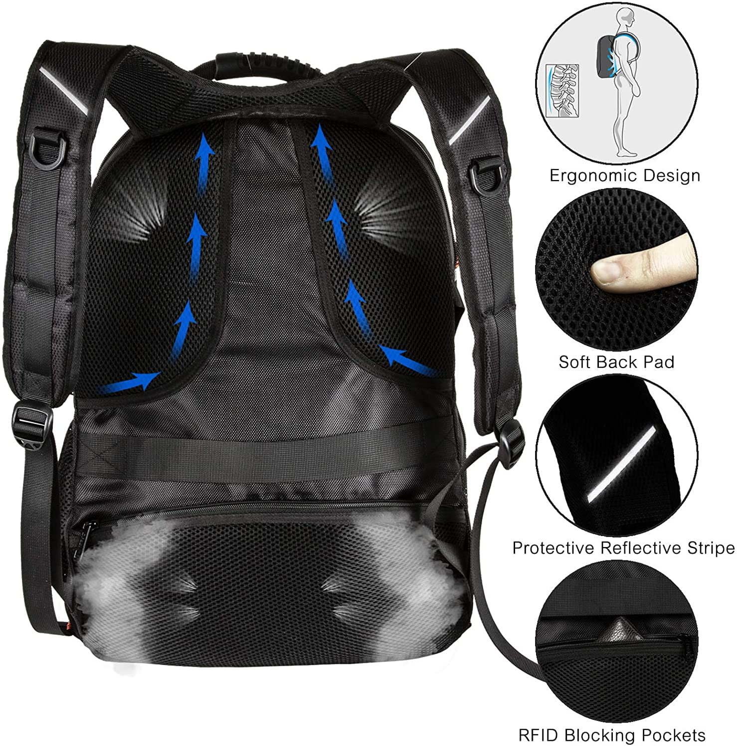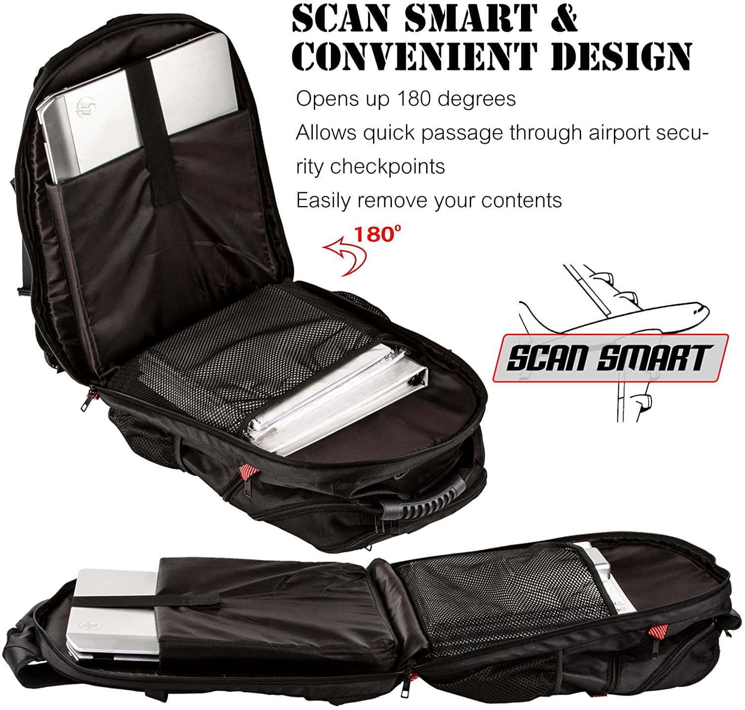 The LARGE CAPACITY travel Backpack has more than 20 independent organizer pockets, perfect for day-to-day use, occasional travel, and air travel. TSA Friendly: Quick access laptop compartment fits 17-inch laptops, opens up quickly at the airport security checkpoint, and ensures a hassle-free laptop-in-bag TSA scan. The USB Charging Port offers easy access to charge your devices. PREMIUM MATERIAL: Made of superior quality polyester fabric with high density nylon lining. Equipped with THREE large main compartments with Anti-theft zippers, adjustable side compression straps, a heavily padded back panel with airflow ventilation technology, and padded contour-shaped shoulder straps with mesh fabric. HEADPHONES hole: Helps you enjoy your favorite music on the go hands-free. RFID blocking pocket protecting your credit cards: An anti-theft pocket and luggage sleeve are designed on the back. A suitcase strap can secure a laptop backpack tightly on the suitcase. GREAT GIFT FOR YOUR LOVED ONES This is a great graduation gift for students of all ages, Versatile for people of all ages, and serves you well as a business backpack, and outdoor travel daypack, for college, high school, and middle school. Unisex design backpack for men, women, boys, girls, teens, and adults.
