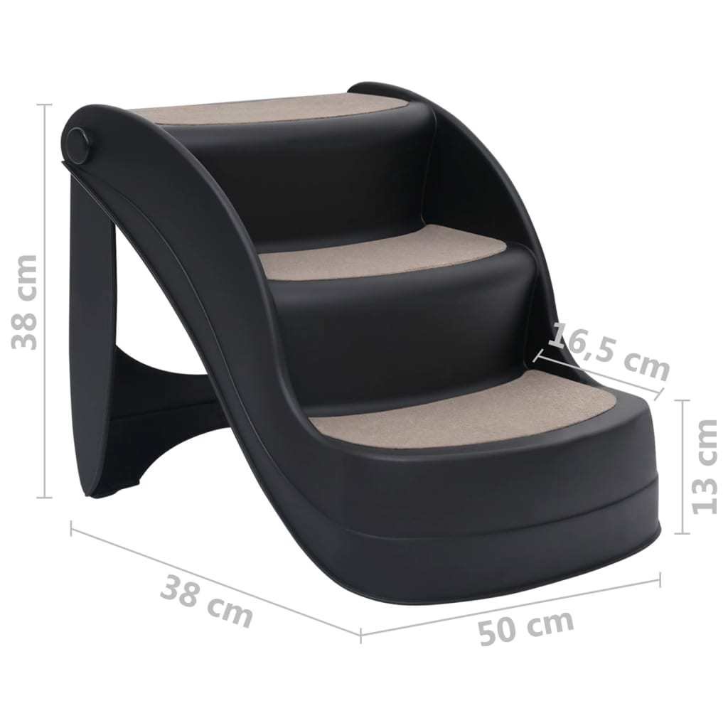 If your dog or cat is not tall enough to reach the bed or sofa; the folding pet stairs make it easier for the pet to get on top of the furniture. The pet steps; weighing only 3 lb; are easy to transport and can support up to 44.1 lb. Although lightweight; this pet step is sturdy and durable. Built-in safety side rails; felt covers and non-skid feet prevent the steps from sliding and your pet from slipping up and down the ladder while running climbing. You can fold the pet ladder and store it easily under a piece of furniture when not in use.Color: BlackMaterial: PP (polypropylene); feltDimensions: 19.7" x 15" x 15" (L x W x H)Weight: 3 lbMax loading weight: 44.1 lbFoldableSuitable for small and large petsNon-skid feetGrip on the stairsAssembly required: No
