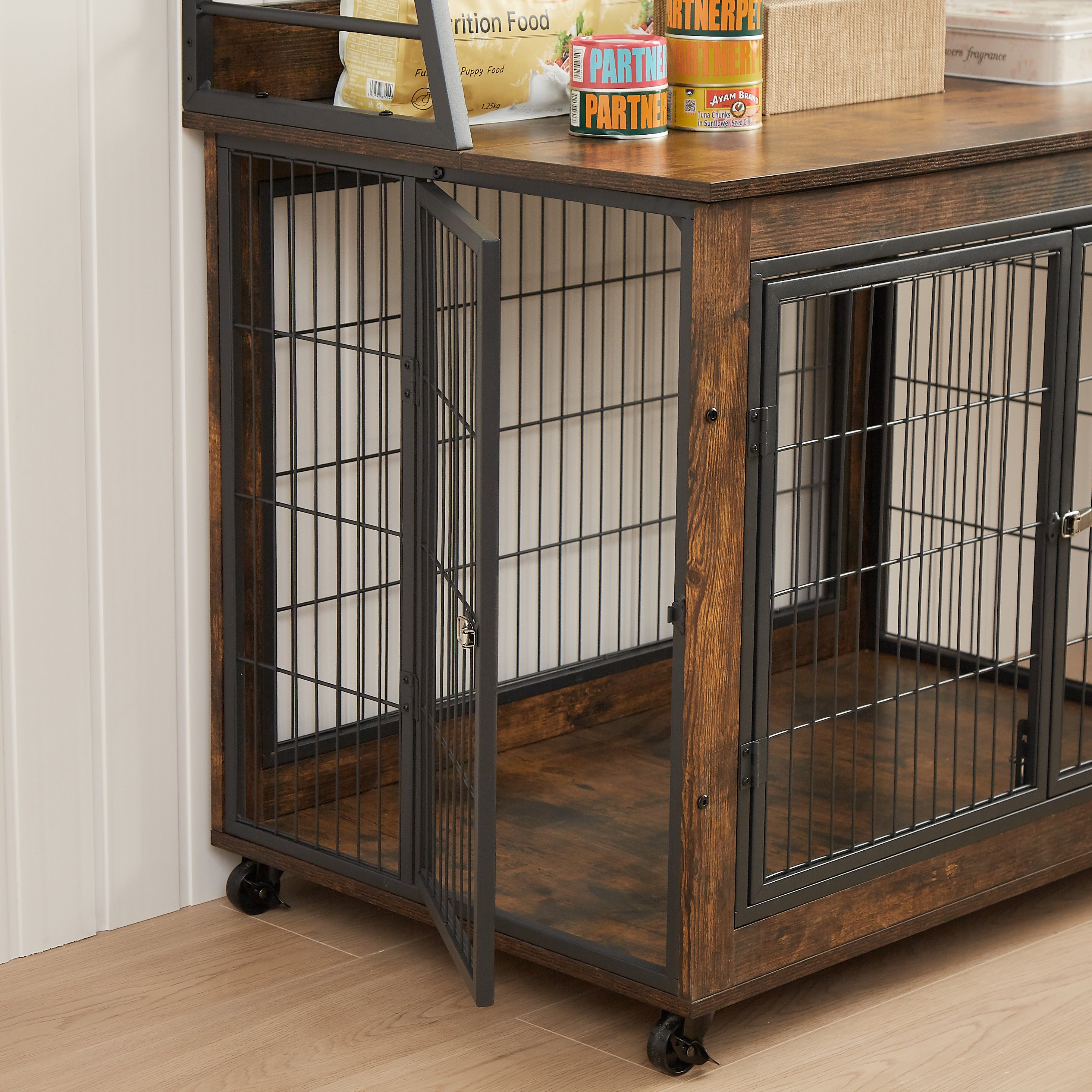 With a 3-tier open shelf, you can put dog-related things on it, such as treats, toys, dog grooming supplies and feeding tools, this shelf makes it very convenient to put and take, and it makes Your crate becomes perfectly organized.