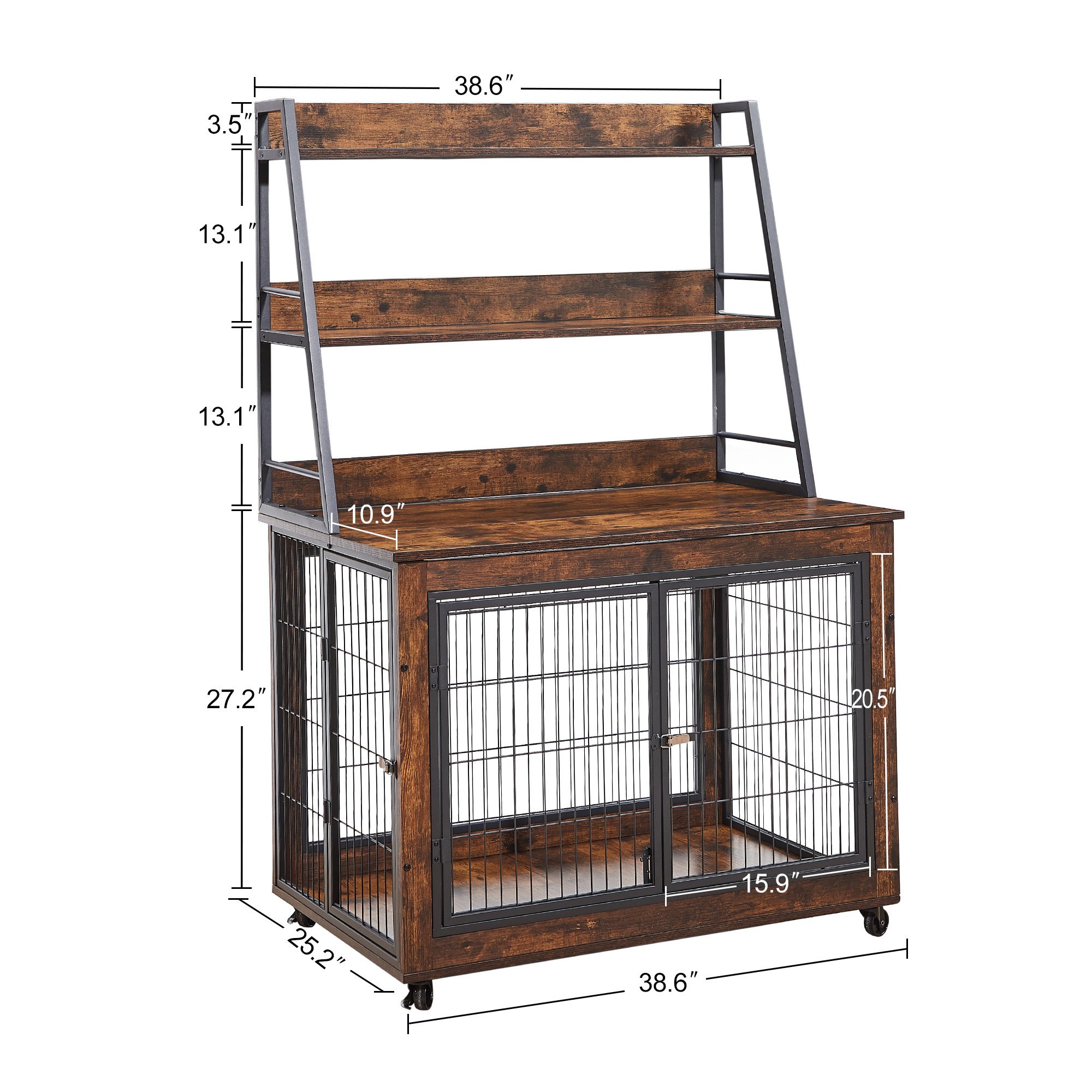 Bottom WheelsYou can effortlessly push this crate to any corner of your home, then lock the wheels to secure the dog crate.Product InformationProduct typedog crateColorRustic BrownMaterialParticleboard,SteelExterior Measurements38.58'' W x 22.5'' D x 27.36'' HInterior Measurements36.22'' W x 22.83'' D x 26'' HMax. Static Load Capacity of the Top150 lbMax. Static Load Capacity of the Bottom150 lbAssembly RequiredAbout 30minNumber of packages1Package Contents1 x Dog Crate, 1 x Assembly Kit, 1 x Instruction