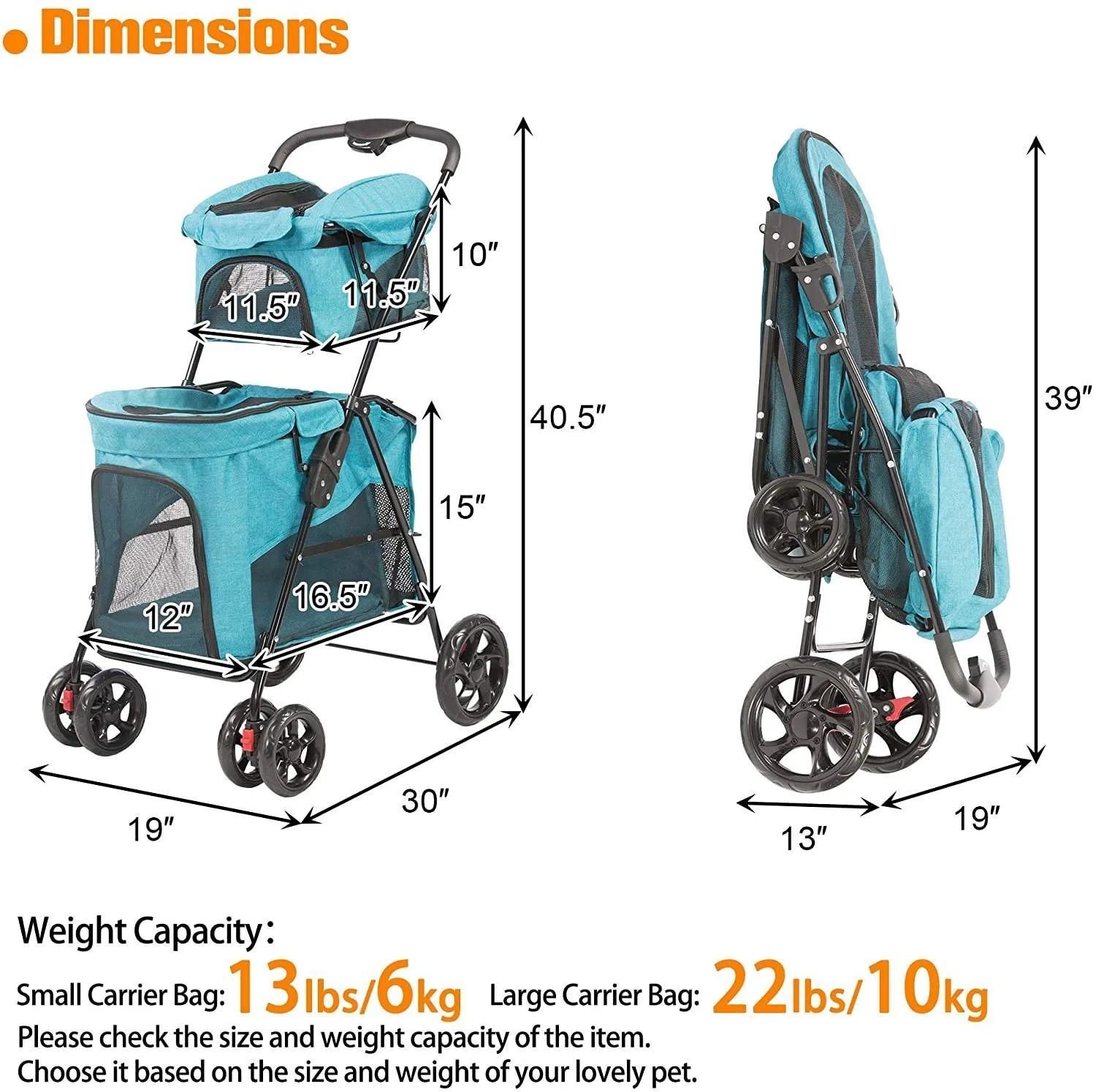 2.Storage Space: The great pet stroller have a convenient storage place under the cloth cage or near handle. Our dog stroller roomy design with large undercarriage. The cat stroller also have hooded Peak Top Window.
