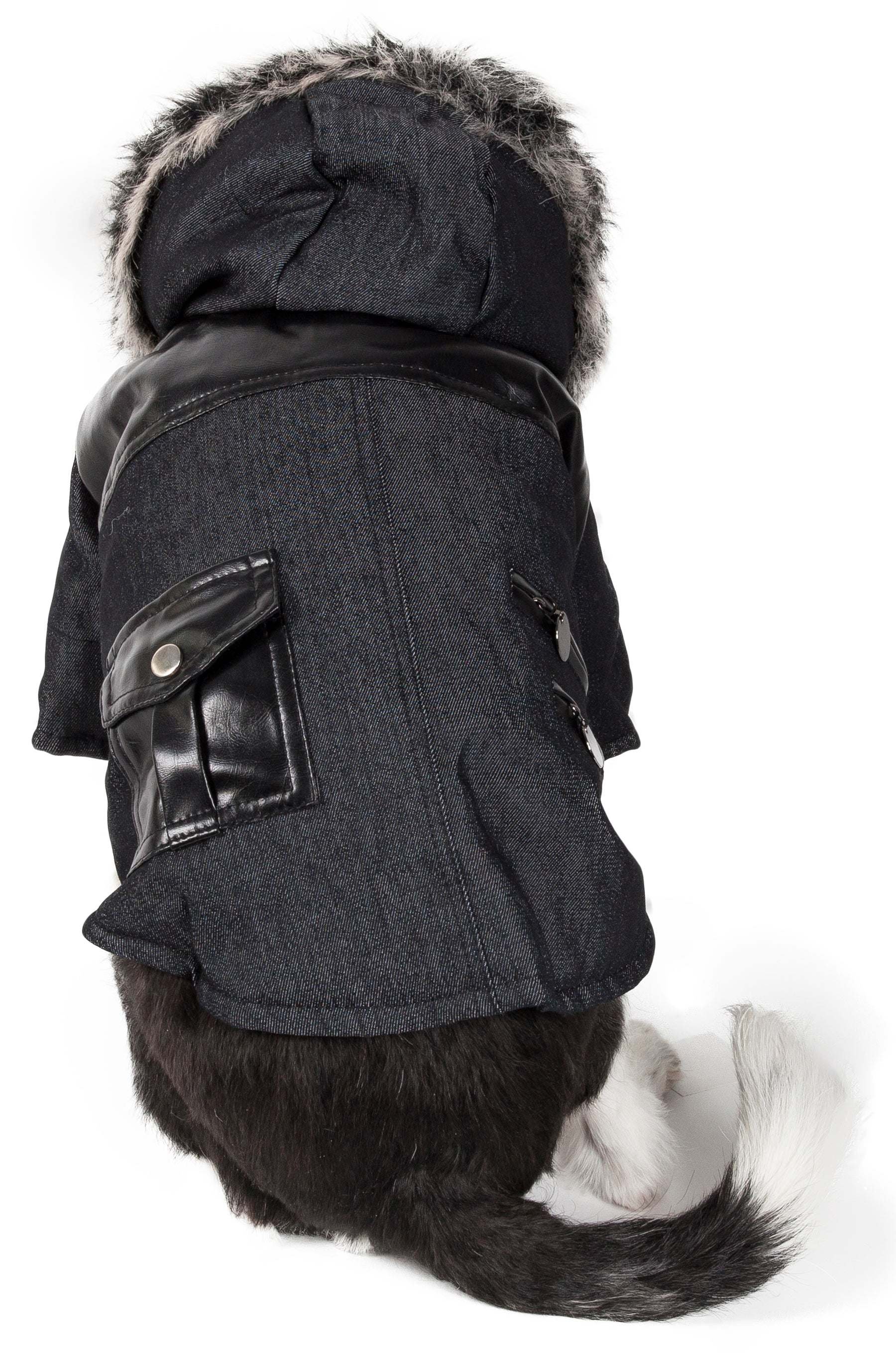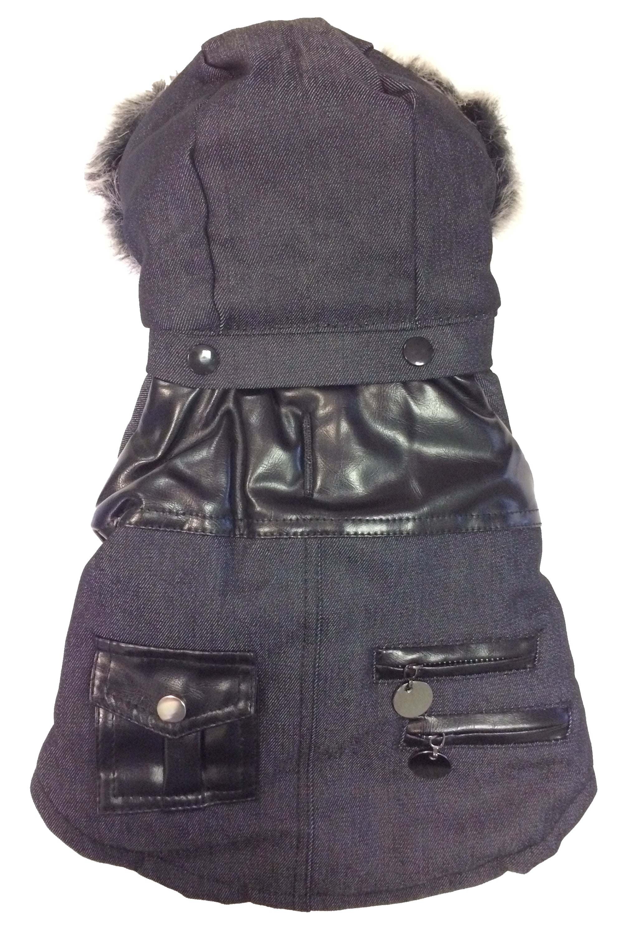 The Pet Life 'Ruff-Choppered' Fashion Dog Coat is composed of denim cotton and pvc fabrics. This pet coat features a back-snap pocket and dual zippered accented pieces along the backside. This dog jacket also features a faux fur hood. Additionally, this pet coat features a snap button closure by the belly for easy on/off access and a leash slit holder behind the neck area. Available in multiple sizes.