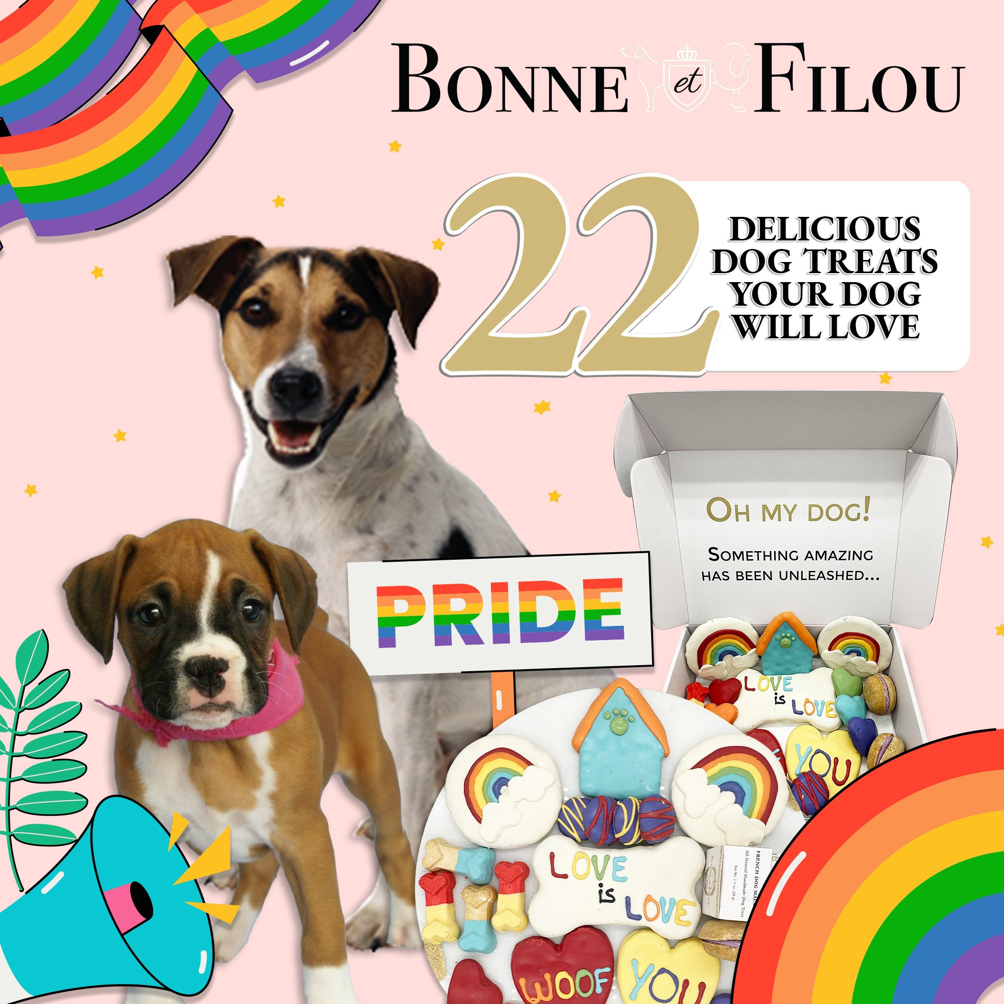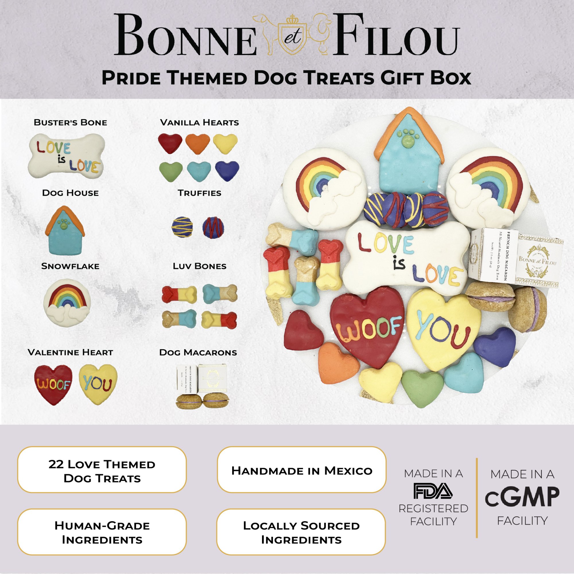 Includes 21 themed treats including various sized hearts, dog bones, macarons, and truffles, etc.