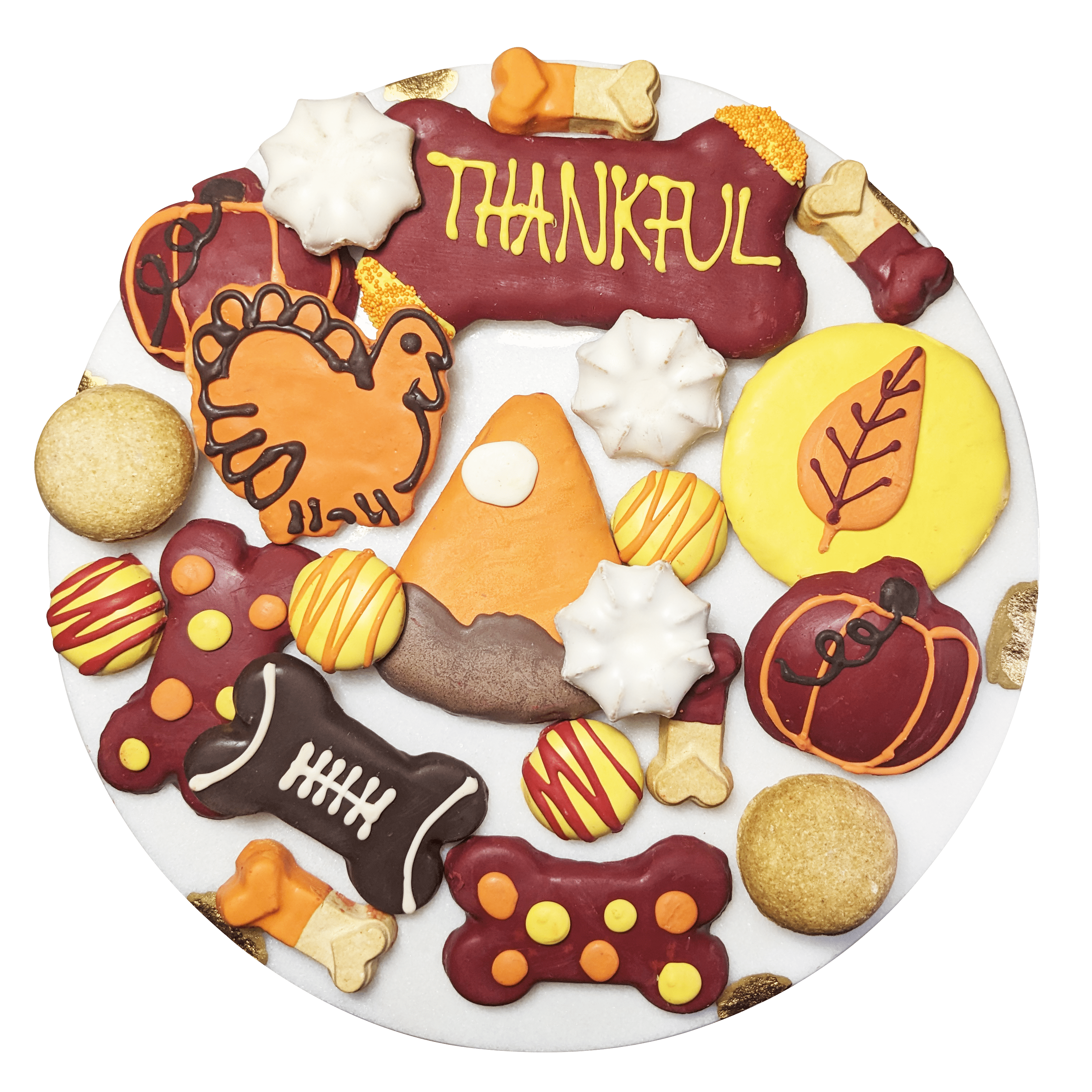 Includes 22 themed treats including autumn leaf, pumpkin pie, and turkey shaped biscuits accompanied by dog macarons, dog bonesetc.